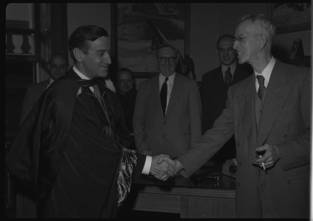 Monsieur B.O. Filteau félicite monsieur Michel Savard revêtu de la toge au bureau du surintendant
