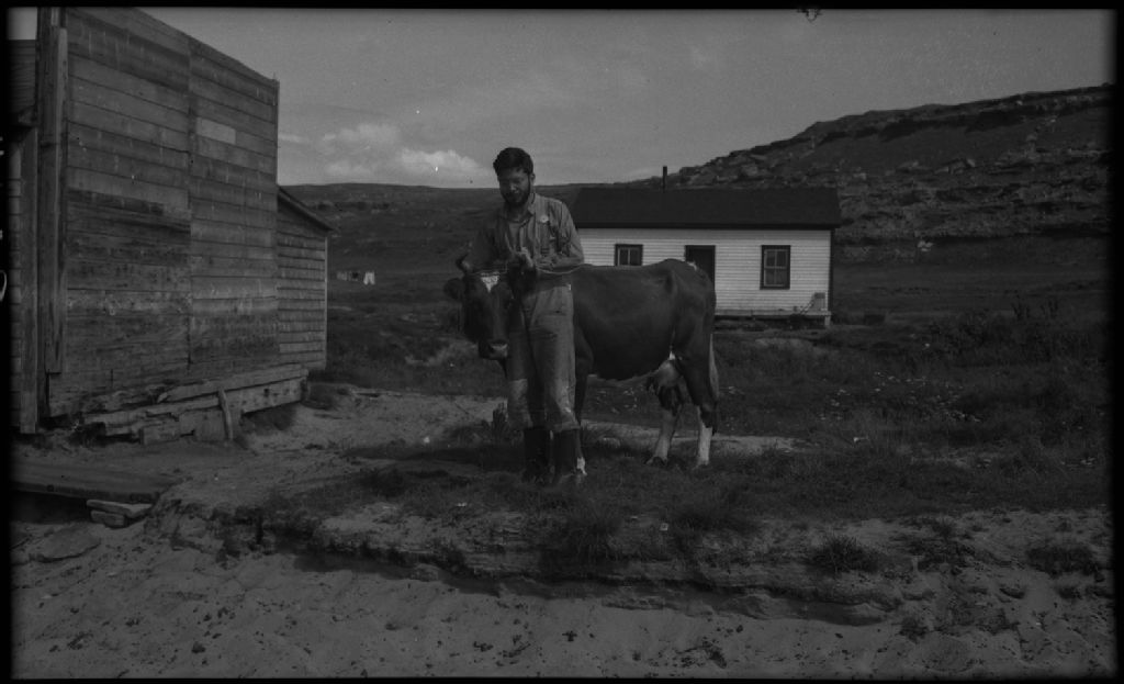 [Homme tenant un bovin par les cornes], [Vers 1950], Archives nationales à Québec, Fonds Ministère de la Culture et des Communications, (03Q,E6,S7,SS1,D2,P93175), Photographe non identifié.