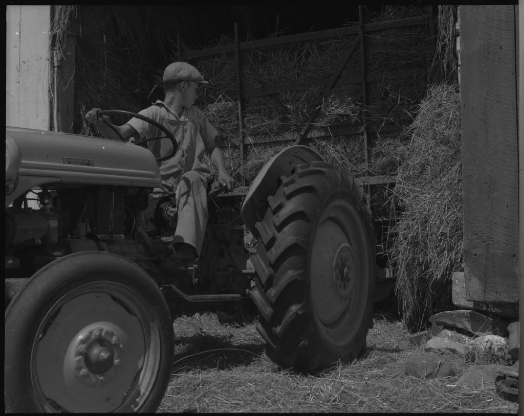 Garçon sur tracteur chez Robert Dubuc. Saint-Wenceslas, comté Nicolet.