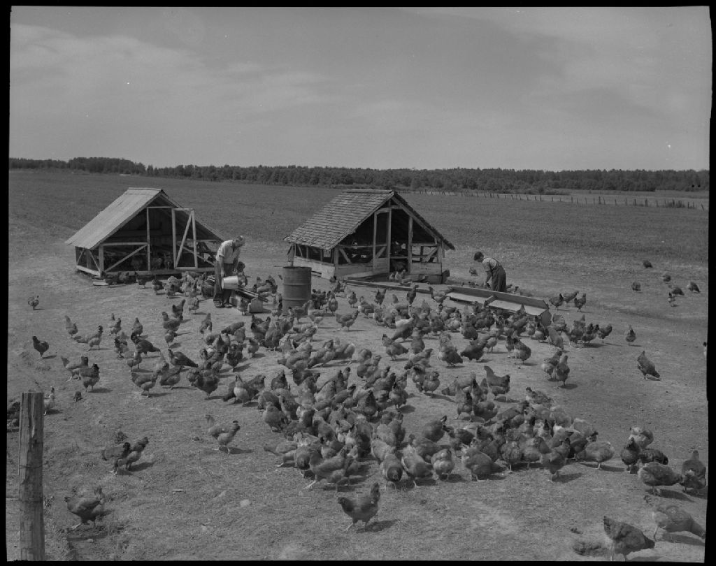 Poules « Rhode Island Red » et deux colonies chez Willie Martel. Aston-Jonction, comté Nicolet., 1952, Archives nationales à Québec, Fonds Ministère de la Culture et des Communications, (03Q,E6,S7,SS1,D2,P93872), Omer Beaudoin.