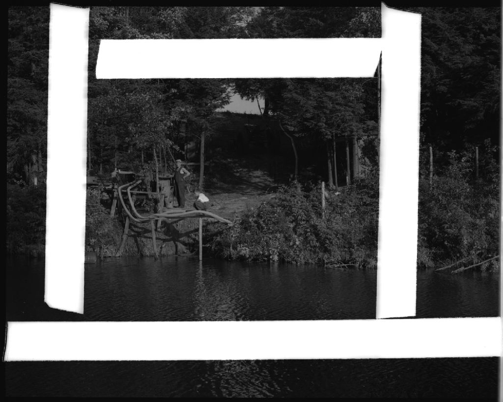 Prise d'eau à la rivière pour la pompe. Chez Robert Daigle, Warwick, comté Arthabaska., 1952, Archives nationales à Québec, Fonds Ministère de la Culture et des Communications, (03Q,E6,S7,SS1,D2,P94088), Omer Beaudoin.