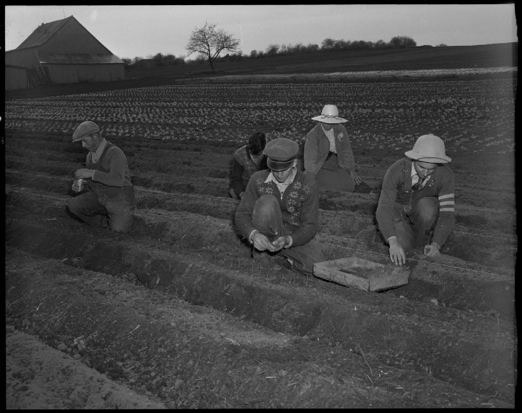 Chez monsieur David Drouin, maraicher de Beauport. Plantation à la ficelle, 1953, Archives nationales à Québec, Fonds Ministère de la Culture et des Communications, (03Q,E6,S7,SS1,D2,P95249), Omer Beaudoin.