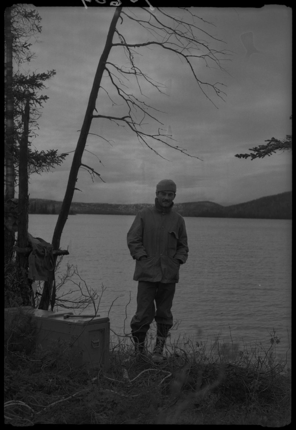 Roger Blais on north shore of lac Premio-Réal. Snow covered hill tops in the backgroung. Wacouno River area