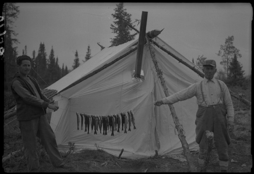 Harry Hamilton and Philias Bernatchez (right) holding morning catch of apeckled trouts from lac Premio-Réal. Wacouno River area, 1953, Archives nationales à Québec, Fonds Ministère de la Culture et des Communications, (03Q,E6,S7,SS1,D2,P95610), Roger Blais.
