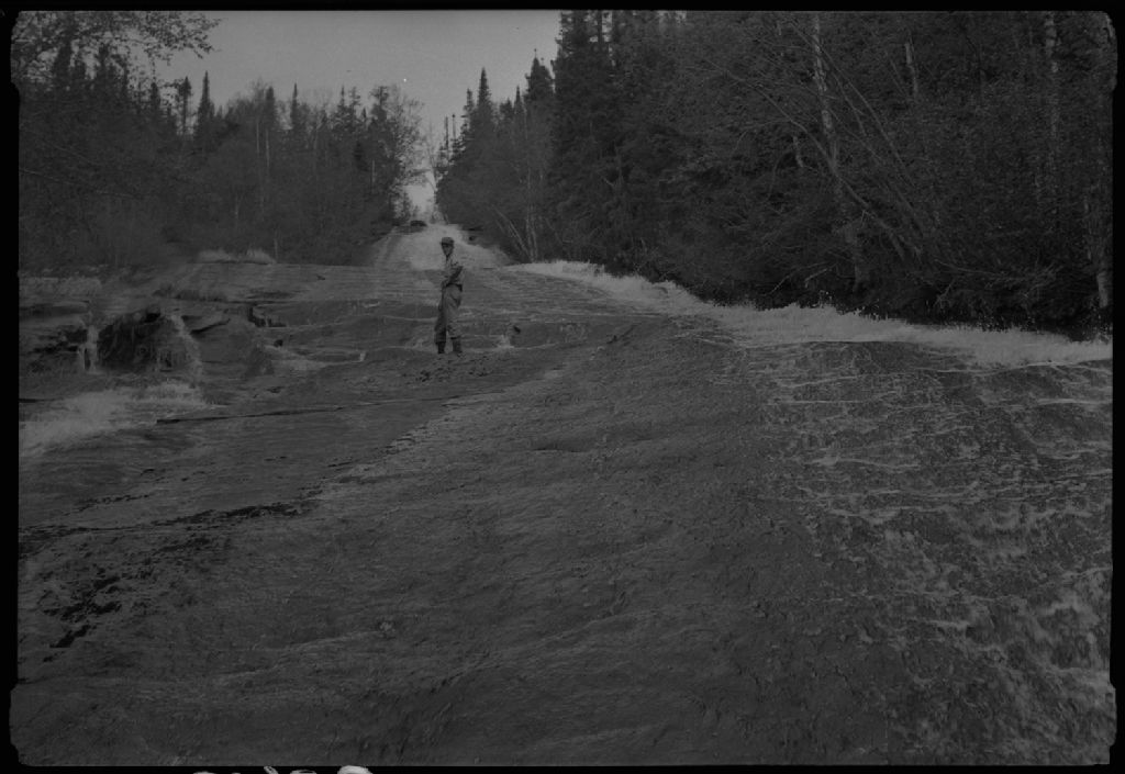 View of high falls (vertical lenght some 350 feet) formed by creek flowing over bare outcrop from a suspended valley into the valley of Nipissis river. Wacouno River area, 1953, Archives nationales à Québec, Fonds Ministère de la Culture et des Communications, (03Q,E6,S7,SS1,D2,P95612), Roger Blais.