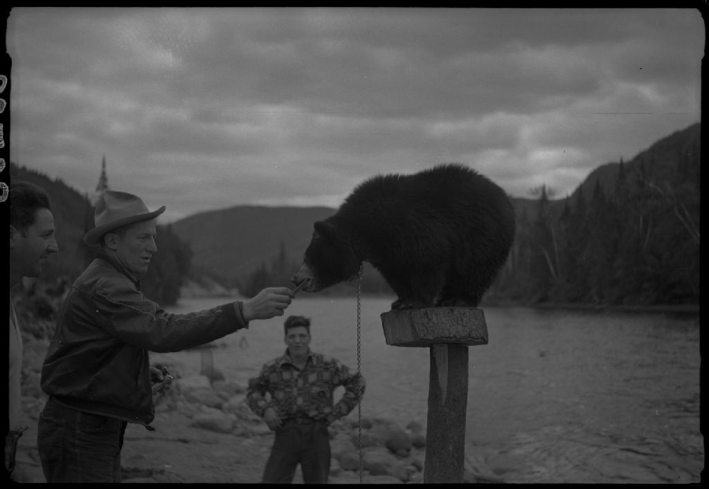 QNSL railroad, mile 55, Victor Cormier feeding bear with a chocolate bar. Wacouno River area