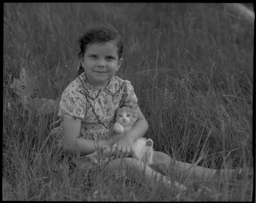 Fillette avec un chat chez monsieur Henri Filion à Kiamika, comté de Labelle
