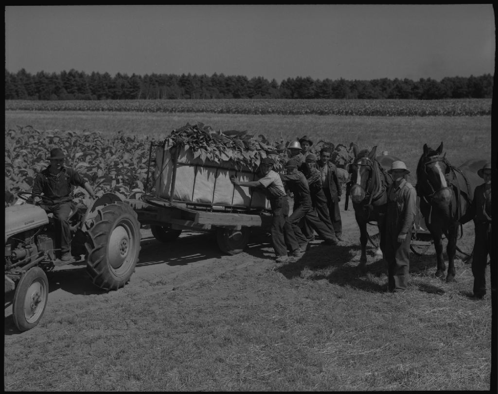 Récolte du tabac à cigarettes chez monsieur Gaston Gadoury à Berthierville, comté de Berthier, 1953, Archives nationales à Québec, Fonds Ministère de la Culture et des Communications, (03Q,E6,S7,SS1,D2,P96911), Omer Beaudoin.