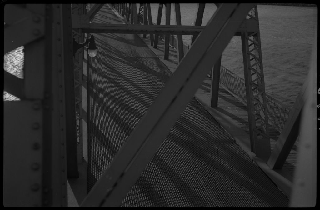 Grillage métallique Irving sur la travée tournante du pont de Chicoutimi, 1953, Archives nationales à Québec, Fonds Ministère de la Culture et des Communications, (03Q,E6,S7,SS1,D2,P97782), Émile Laurence.