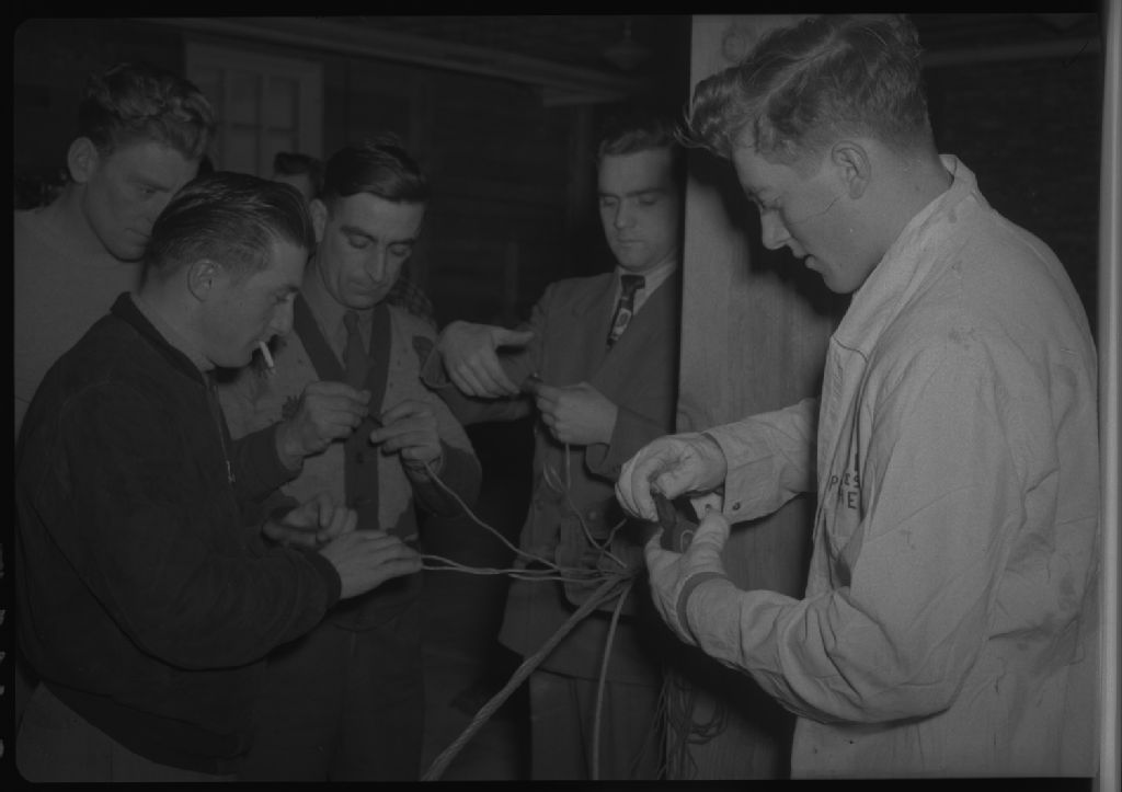 Épissure d'un cable d'acier par les élèves du cours donné aux Madelinots. École d'apprentissage de Grande Rivière.