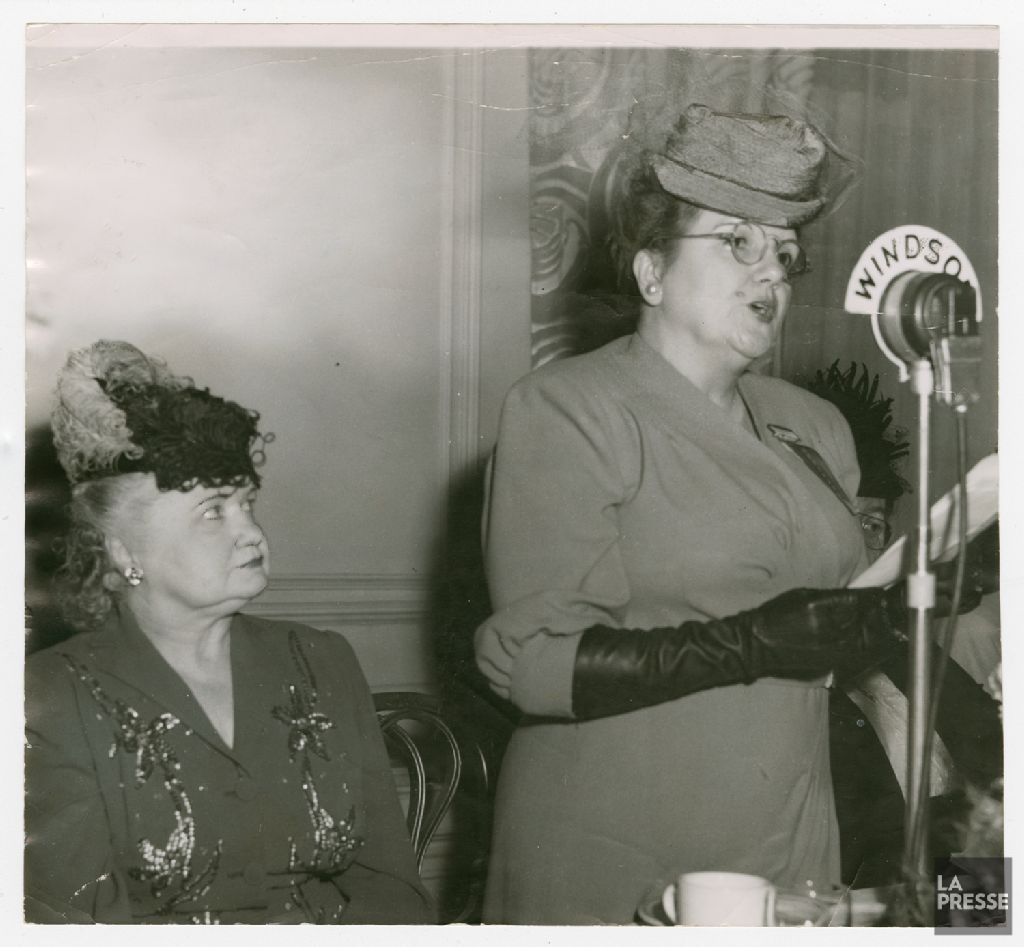 - Le document montre Laure Hurteau prononçant une allocution à l'hôtel Windsor. À ses côtés, on voit Bertha-Andréa Bourgie