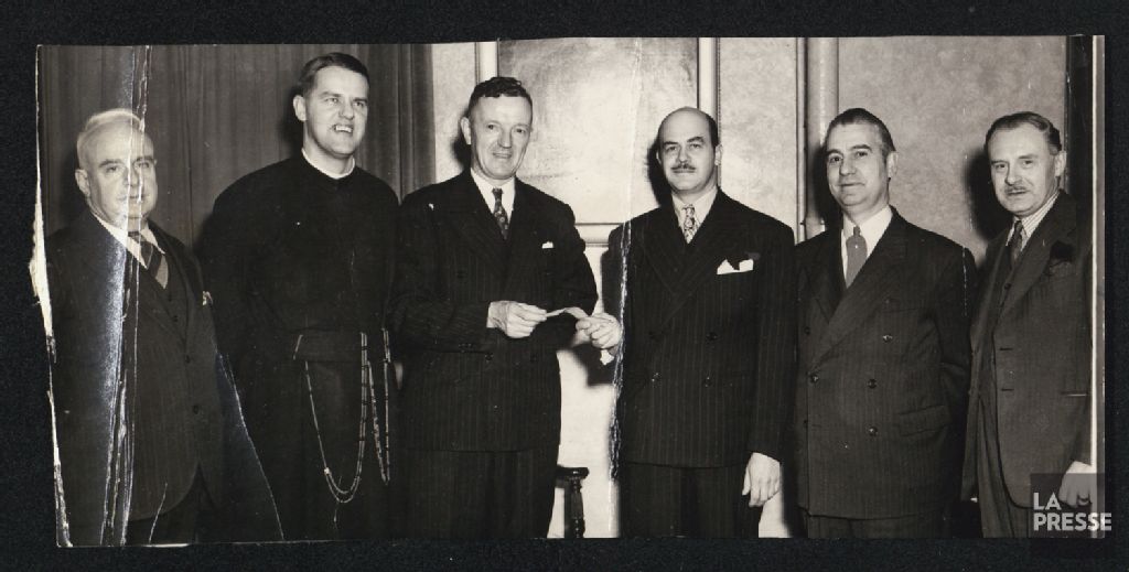 - Le dossier porte sur la contribution de La Presse et de l'Association catholique des voyageurs de commerce à la campagne de souscription afin d'amasser les fonds nécessaires pour un Centre paroissial destiné aux sports. Les documents montrent des remises de chèques par Gilles Berthiaume et Maurice-L. Faucher.