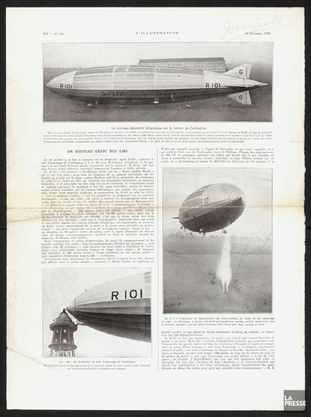 - Les documents illustrent le dirigeable R-101 en vol, au sol, dans un hangar ainsi que des pièces intérieures. Le dossier illustre aussi les lieux de l'écrasement du dirigeable en Picardie en France en octobre 1930, des survivants de la catastrophe et les funérailles des victimes à Beauvais et à Londres