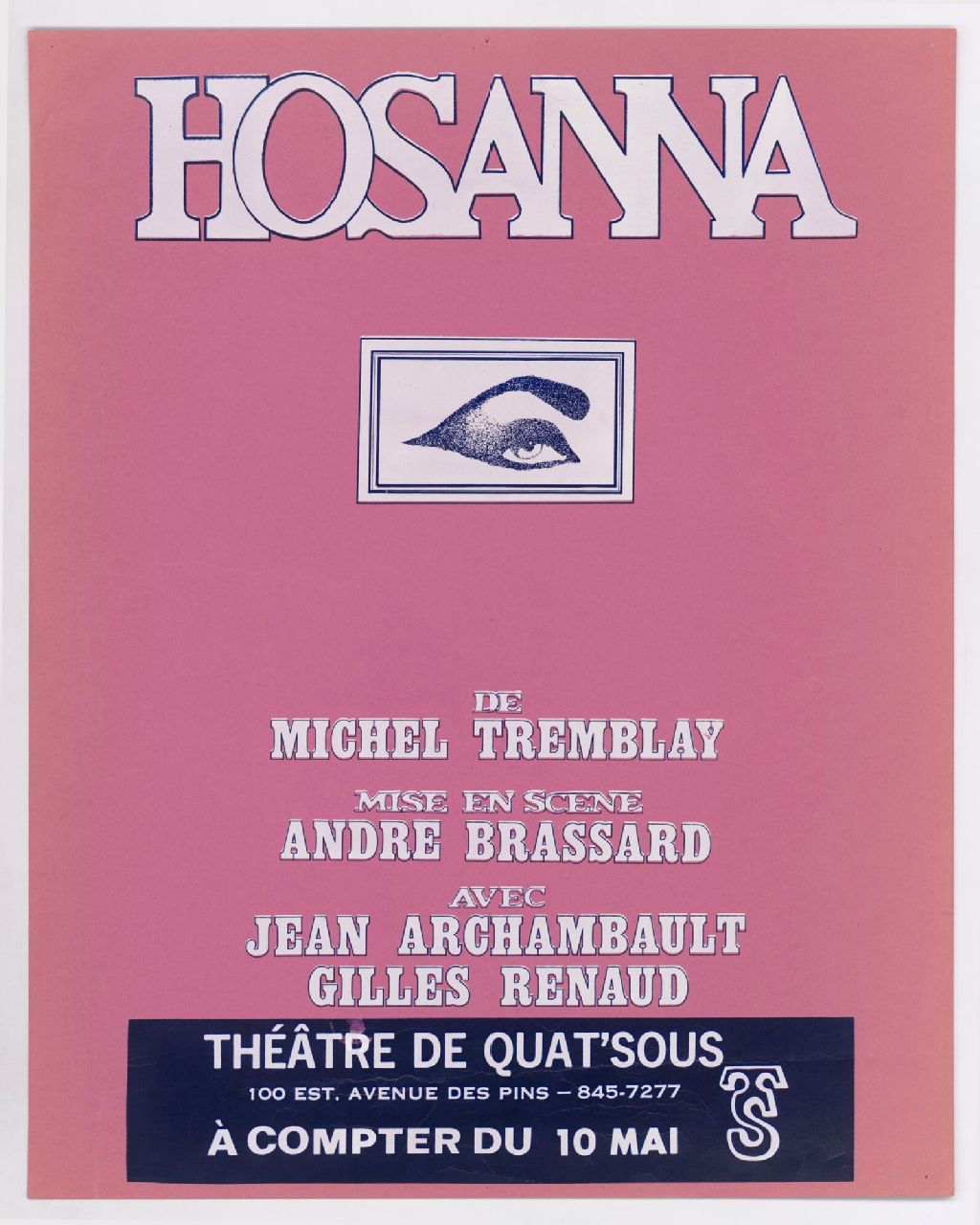 Hosanna, de Michel Tremblay, mise en scène André Brassard : avec Jean Archambault, Gilles Renaud : Théâtre de Quat'sous ... à compter du 10 mai