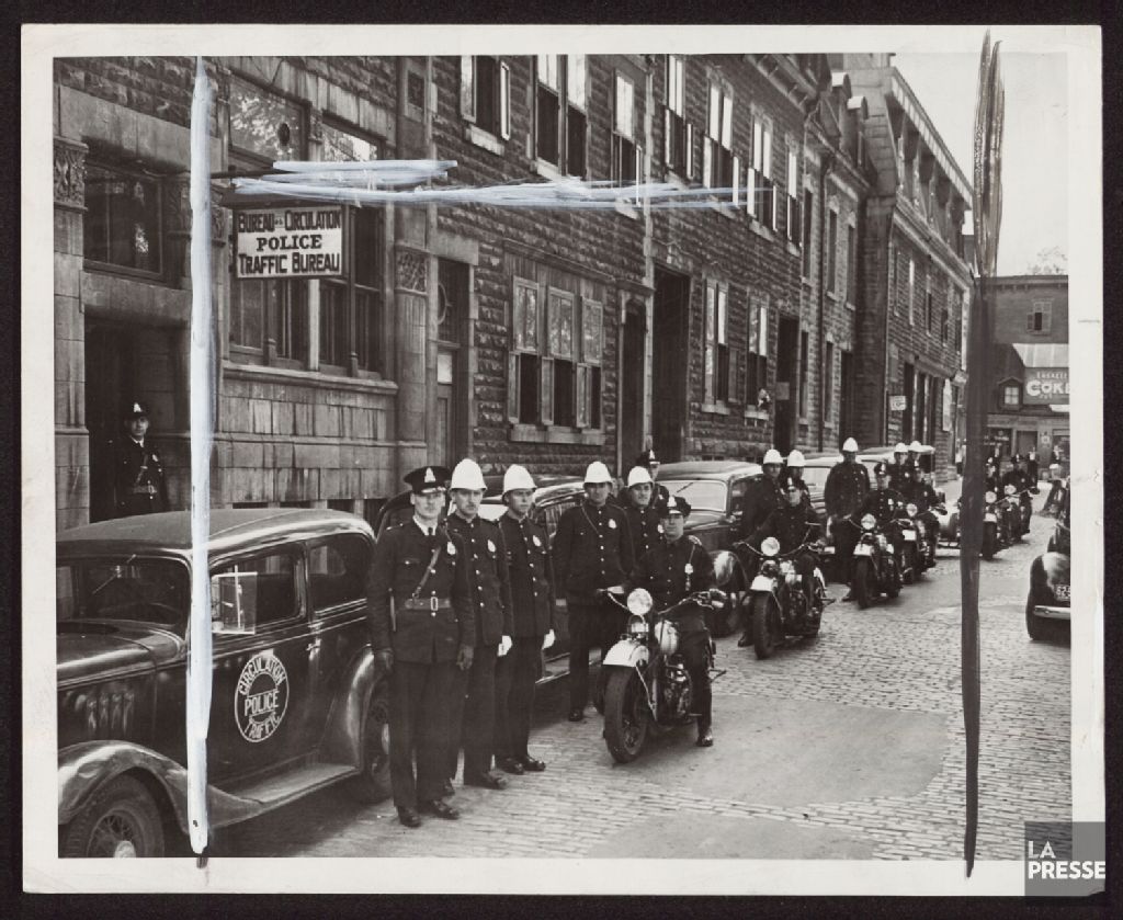 - Le dossier illustre des policiers à motocyclettes et debout près de voitures de police devant le Bureau de la Circulation.