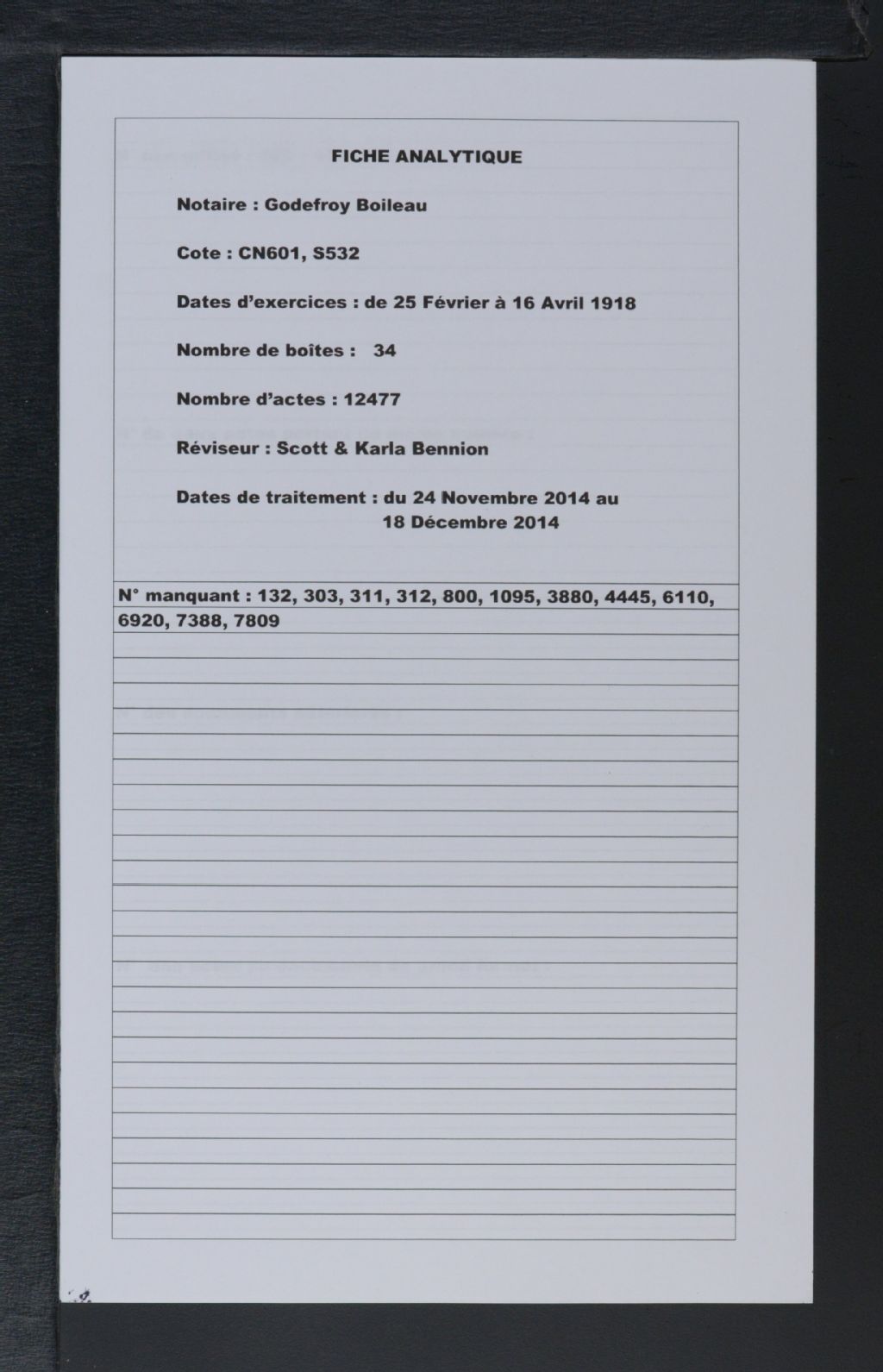 Godefroy Boileau, 1869-1918, Archives nationales à Montréal, Fonds Cour supérieure. District judiciaire de Montréal. Greffes de notaires, (06M,CN601,S532).
