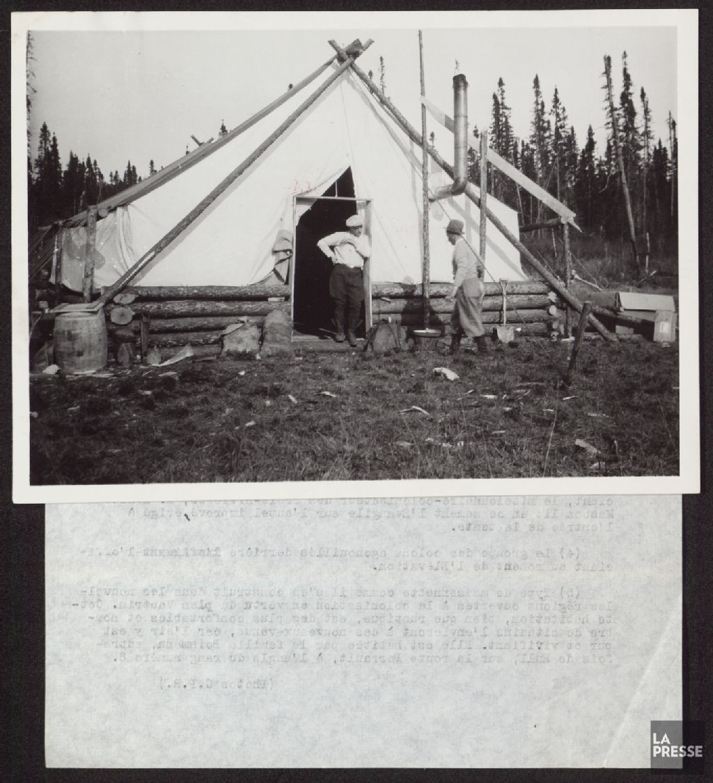- Le dossier illustre l¿établissement de colons dans le Témiscamingue. On y voit notamment des tentes-dortoirs, des habitations temporaires, des terres récemment défrichées et de nouvelles constructions dont des maisons, bâtiments de ferme, une pulperie et un pont couvert. Le dossier illustre également un traîneau à chien et les chutes Openicon