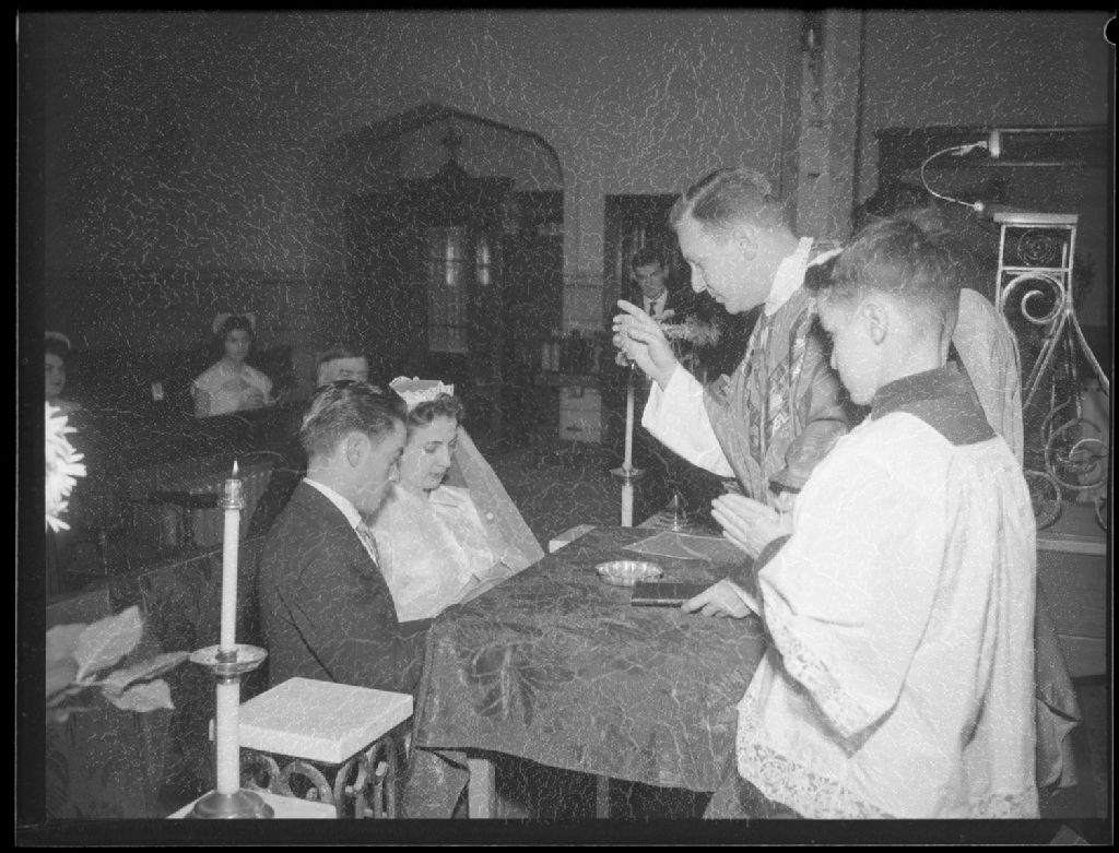 Mariage de Claire Dubé et de René Simard, 23 novembre 1957, Archives nationales à Gatineau, Fonds Champlain Marcil, (07H,P174,S1,D12879), Attribuée à Champlain Marcil.