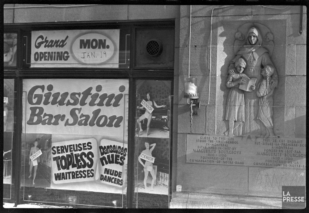 - Le dossier porte sur les reportages intitulés : Beurre et margarine pour la page alimentation ; Façade du bar salon "Giustini". Les documents montrent notamment un emballage de margarine de marque Fleischmann's, ainsi qu'une plaque commémorative sur laquelle nous pouvons lire "Près de cet endroit fut située la première école à Montréal, fondée en 1657 par Marguerite Bourgeoys, 1620-1700, fondatrice de la Congrégation Notre-Dame", tout juste à côté de l'entrée du bar de danseuses nues, à l'angle de la rue Le Royer et du boulevard Saint-Laurent