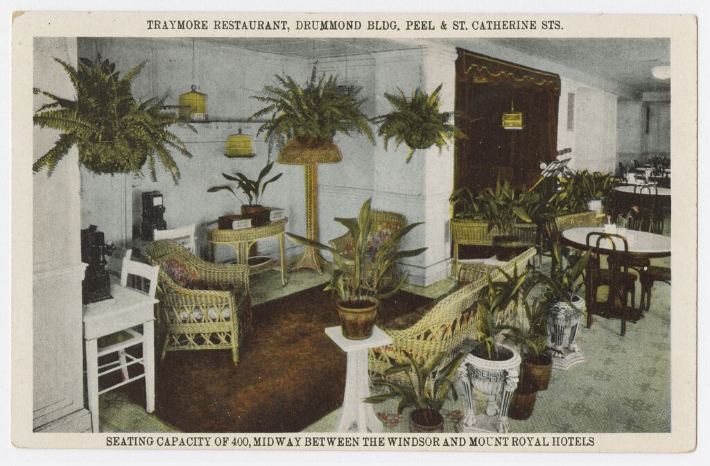 Traymore Restaurant, Drummond Bldg., Peel & St. Catherine Sts. : seating capacity of 400, midway between the Windsor and Mount Royal hotels