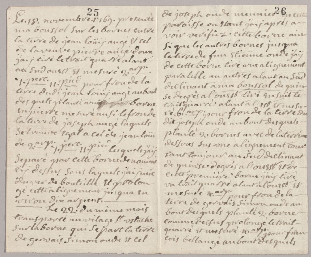 Procès-verbal de bornage effectué par l’arpenteur Jean-Baptiste Grenier, 18 et 22 novembre 1769, Archives nationales à Québec, Fonds Famille Joly de Lotbinière, (03Q,P351,S11,P9).