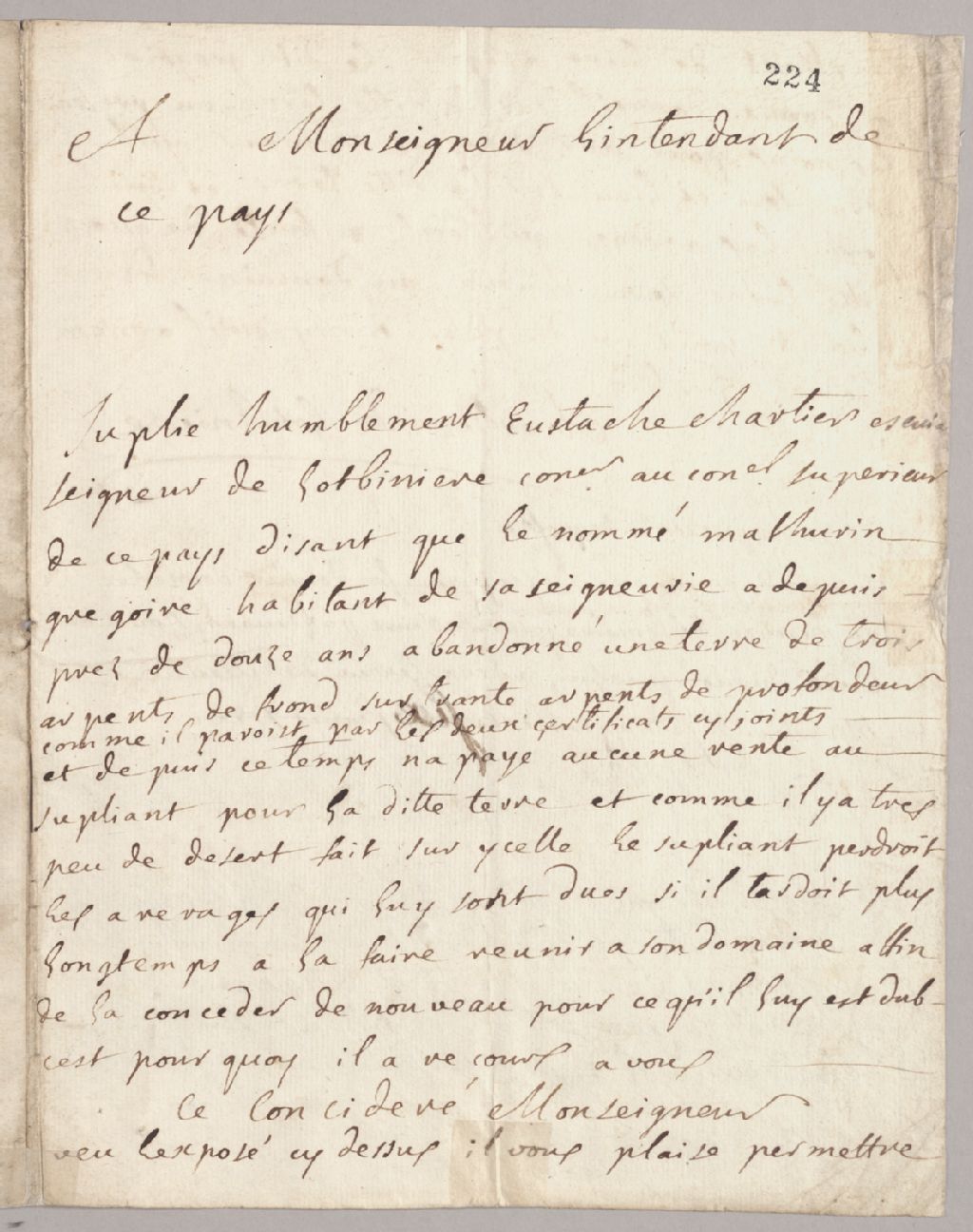- Requête du seigneur Eustache Chartier de Lotbinière afin de réunir la concession de Mathurin Grégoire, abandonnée depuis 12 ans, au domaine seigneurial