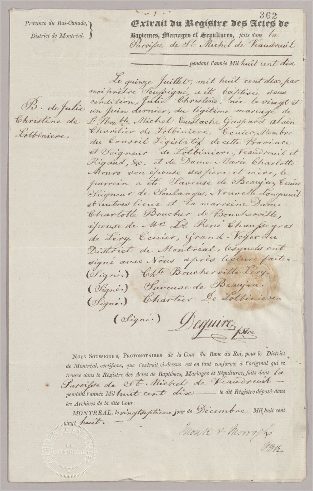 - Extrait de baptême de Julie-Christine de Lotbinière, fille de [Michel-Eustache-Gaspard-Alain Chartier de Lotbinière], née 15 juillet 1810