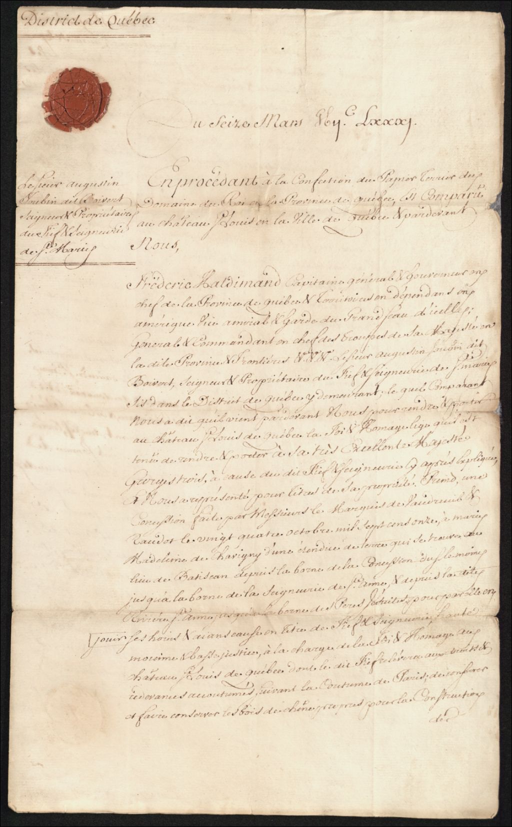 Foi, hommage et reconnaissance au terrier entre Augustin Joubin-Boisvert et Noël Noyer et Geneviève Moreau par Théophile-Hector De Cramahé, gouverneur et secrétaire et président du Conseil.*Sceau du Gouverneur