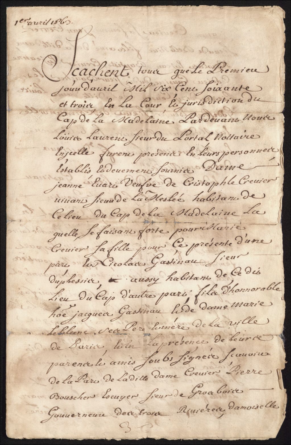 - Contrat de mariage*Collation d¿un document de 1663entre Louis Gastineau et Nicolas Gastineau et Marie Crevier par Louis Laurens du Portal, notaire