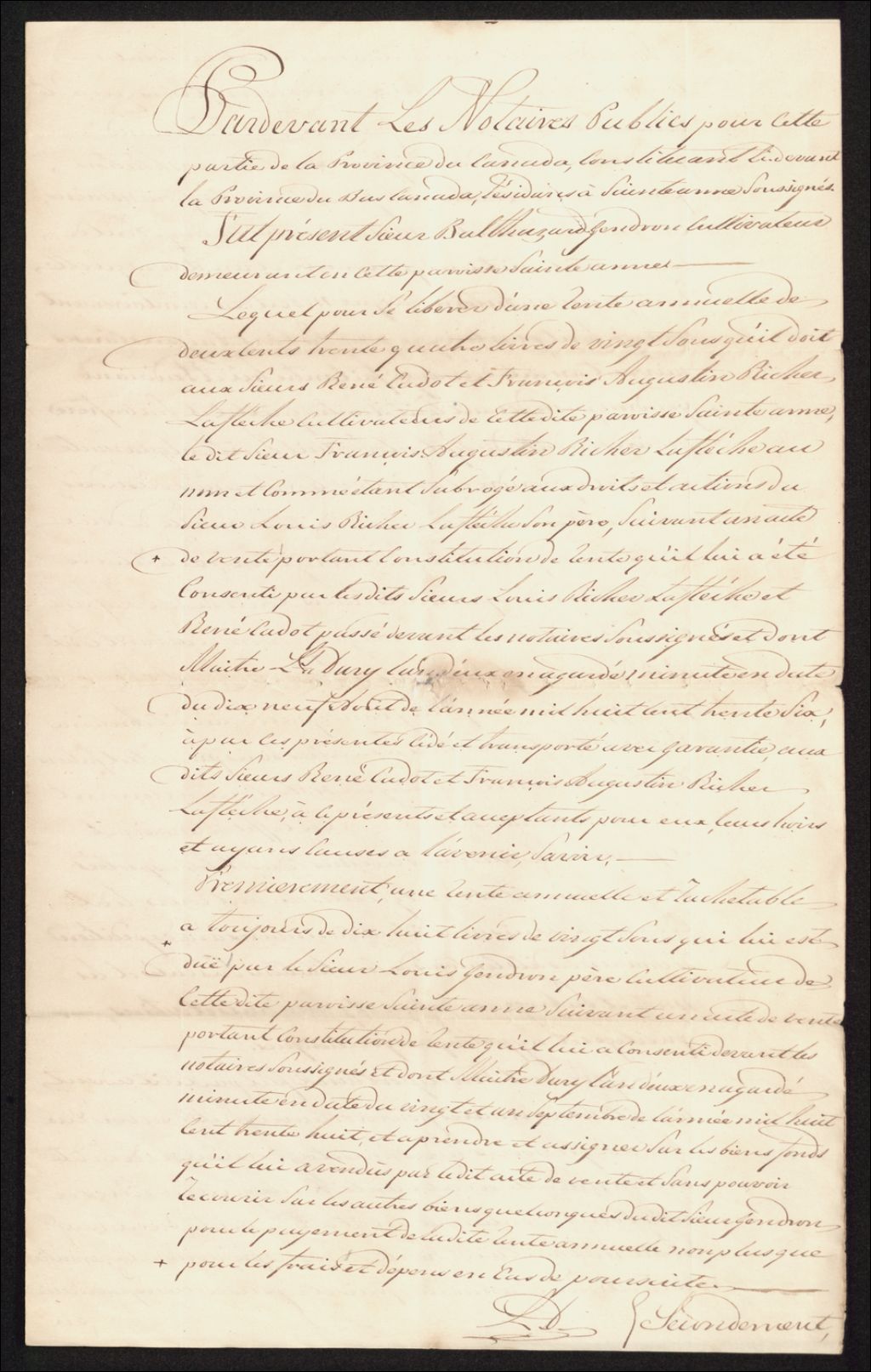 Transport (créance pour rentes) entre Louis Richer-Laflèche et René Cadot et Balthasard Gendron par Joseph-Casimir Dury, notaire