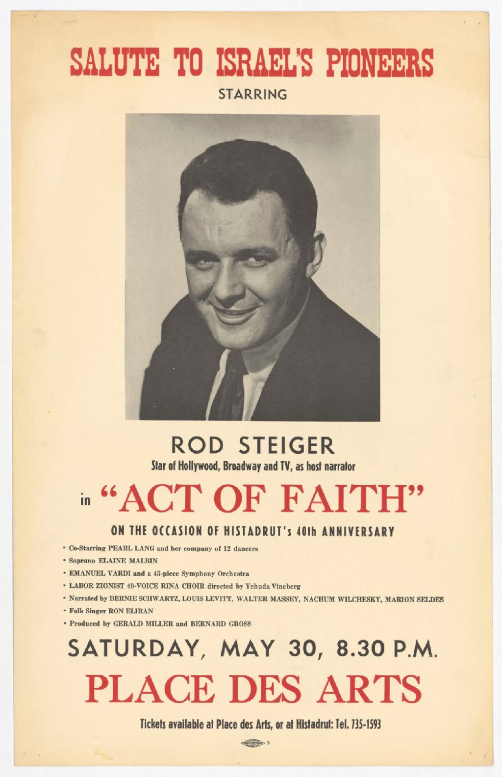 Salute to Israel's pioneers starring Rod Steiger, star of Hollywood, Broadway and TV, as host narrator in Act of faith on the occasion of Histadrut's 40th anniversary...