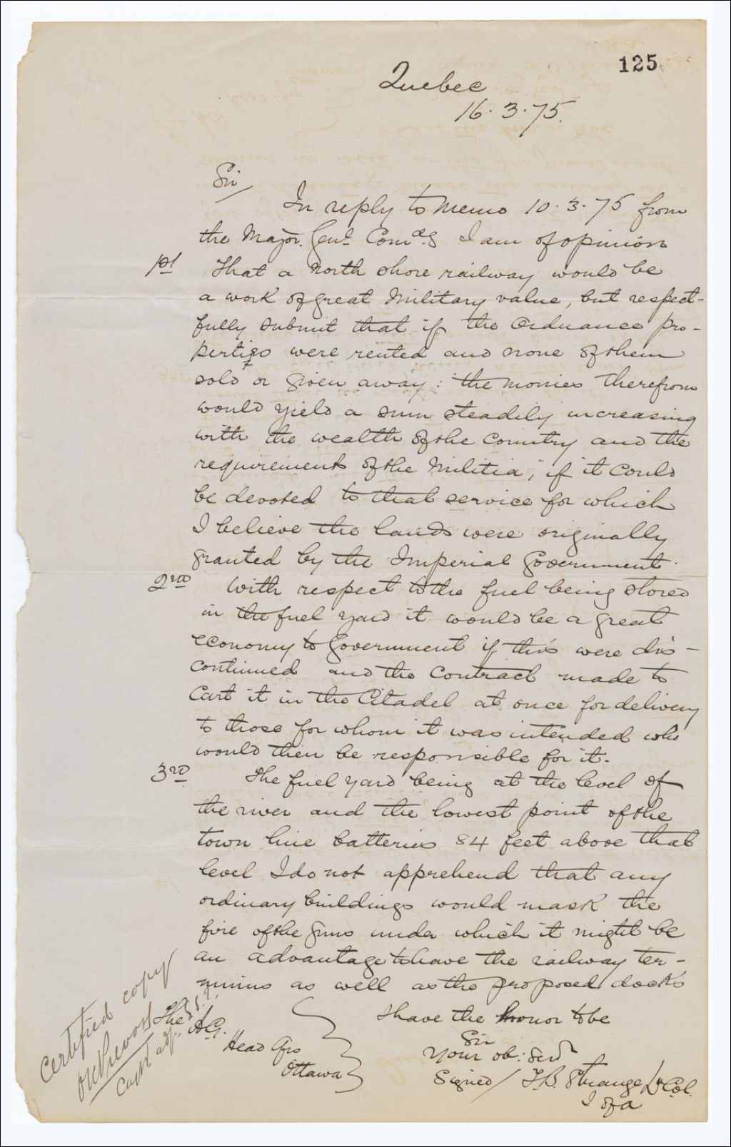 Rapport du colonel T. B. Strange, 16 mars 1875, Archives nationales à Québec, Fonds Famille Joly de Lotbinière, (03Q,P351,S4,SS1,P125).
