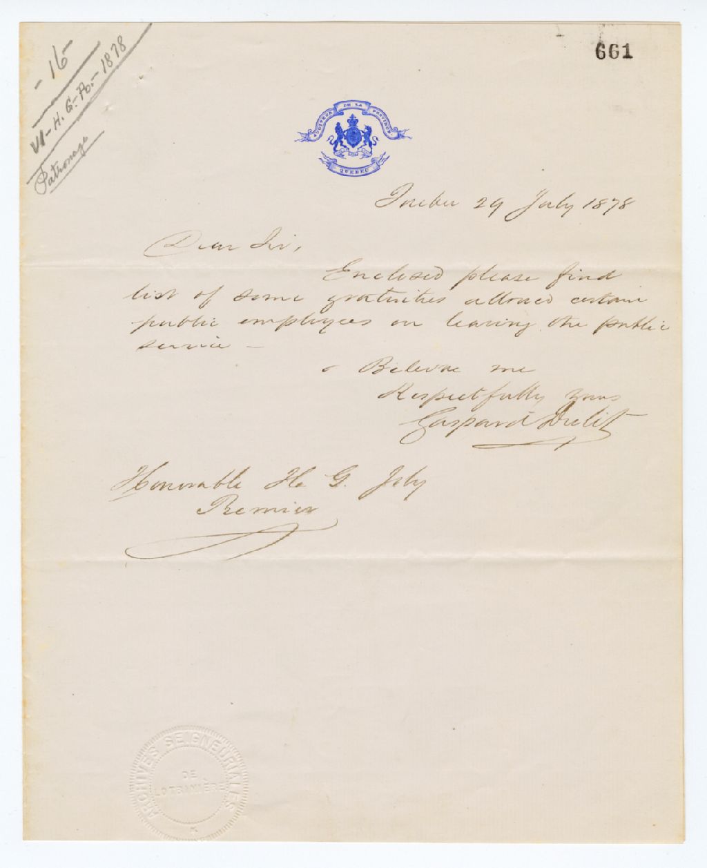 Lettre de Gaspard Drolet à Henri-Gustave Joly