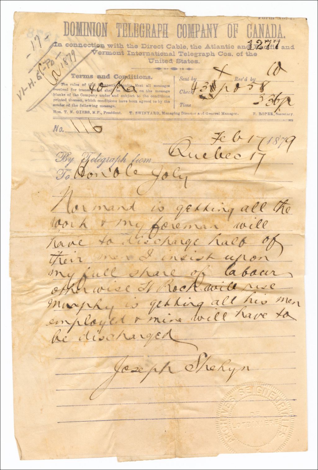 Télégramme de Joseph Shehyn à Henri-Gustave Joly, 17 février 1879, Archives nationales à Québec, Fonds Famille Joly de Lotbinière, (03Q,P351,S4,SS1,P1277).