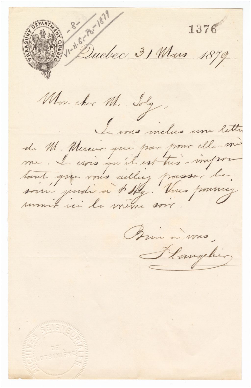 Lettre de F. Langelier à Henri-Gustave Joly, 31 mars 1879, Archives nationales à Québec, Fonds Famille Joly de Lotbinière, (03Q,P351,S4,SS1,P1376).