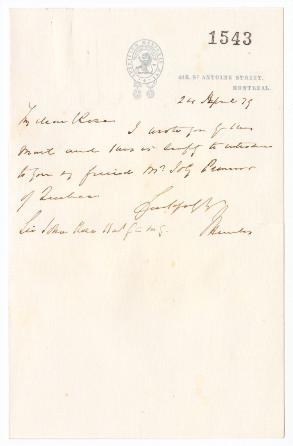 Lettre de Francis Hincks à Sir John Rose, 24 avril 1879, Archives nationales à Québec, Fonds Famille Joly de Lotbinière, (03Q,P351,S4,SS1,P1543).