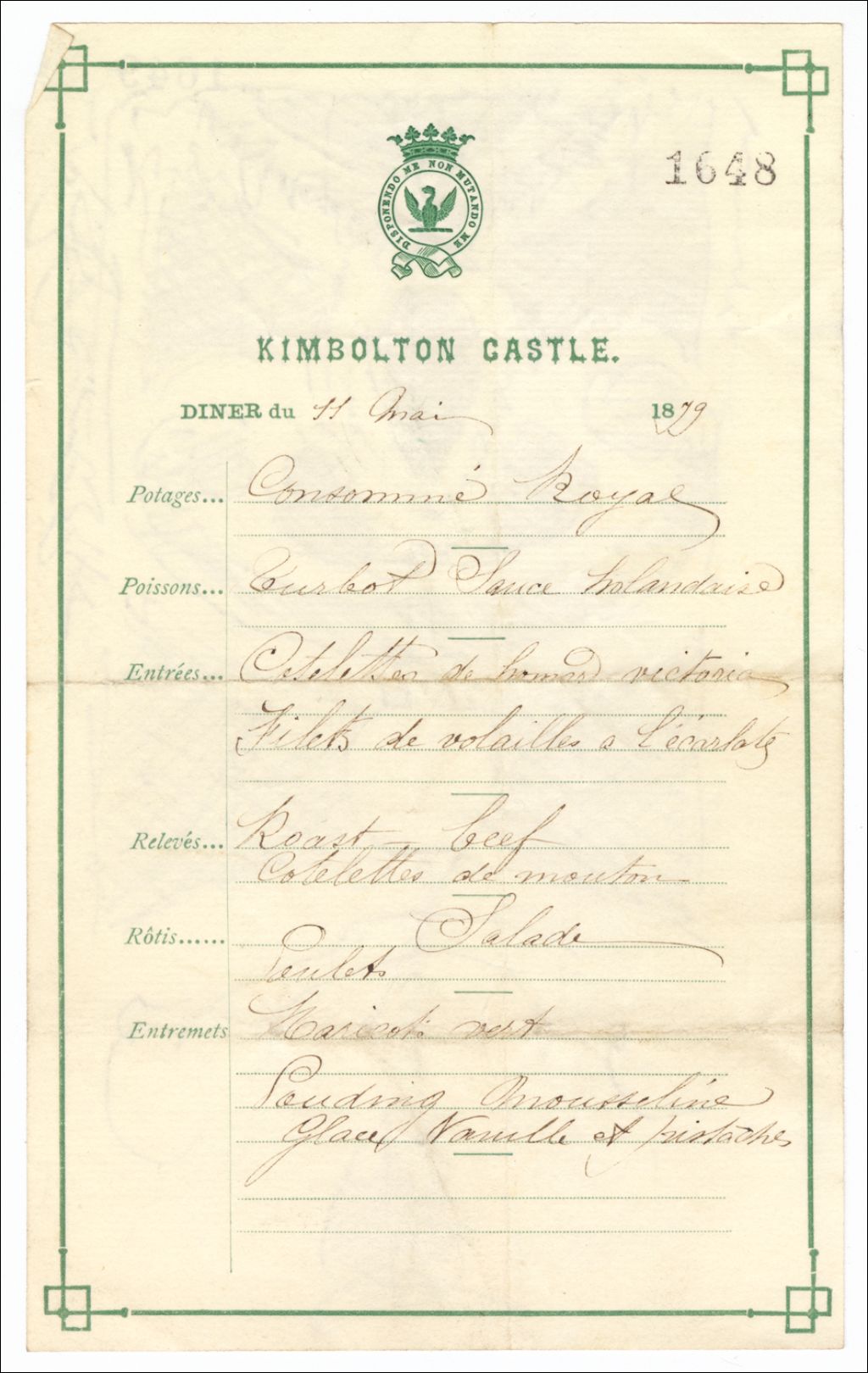 Menu dîner du Kimbolton Castle, 11 mai 1879, Archives nationales à Québec, Fonds Famille Joly de Lotbinière, (03Q,P351,S4,SS1,P1648).