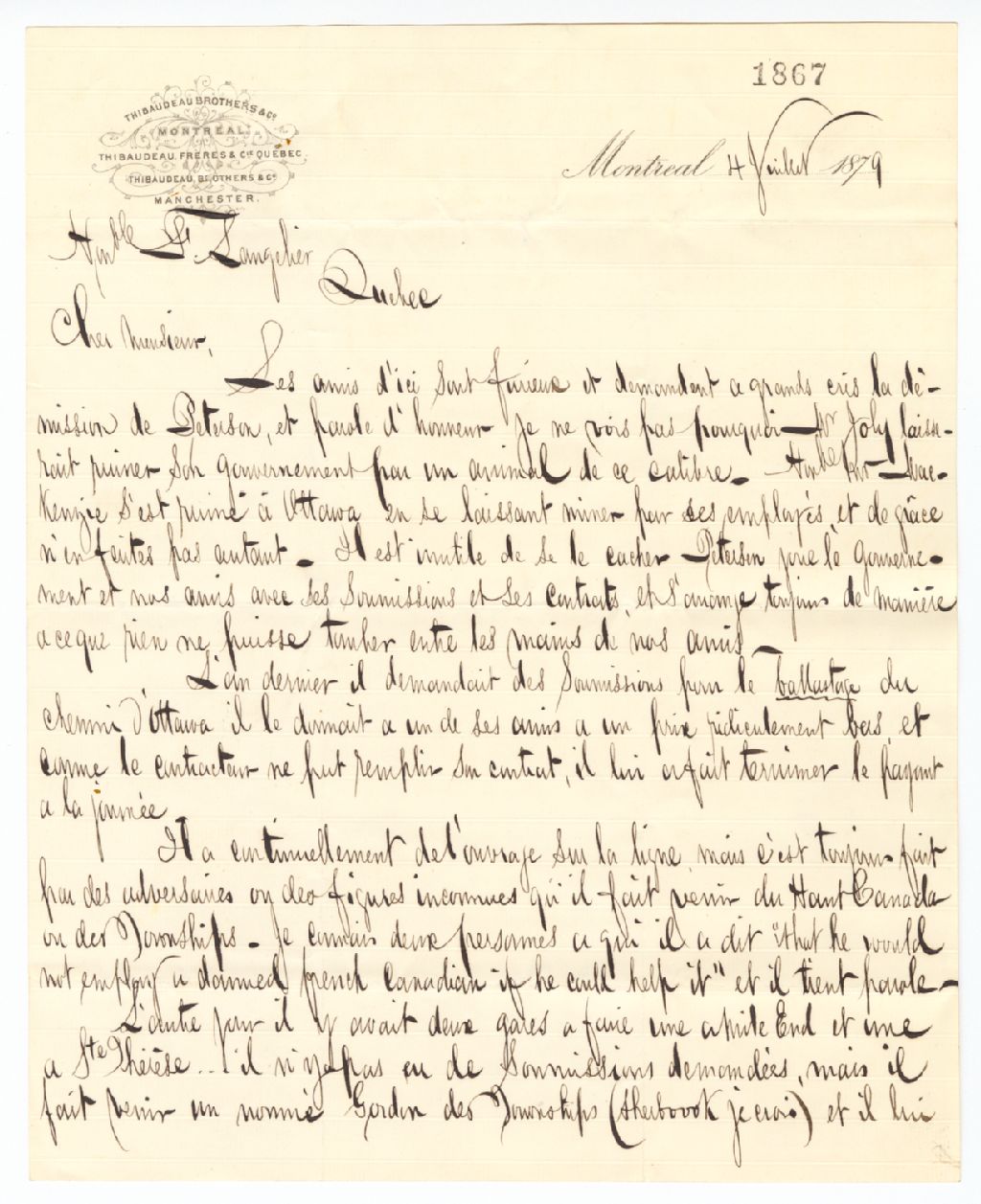 Lettre de R. Thibaudeau à F. Langelier, 4 juillet 1879, Archives nationales à Québec, Fonds Famille Joly de Lotbinière, (03Q,P351,S4,SS1,P1867).