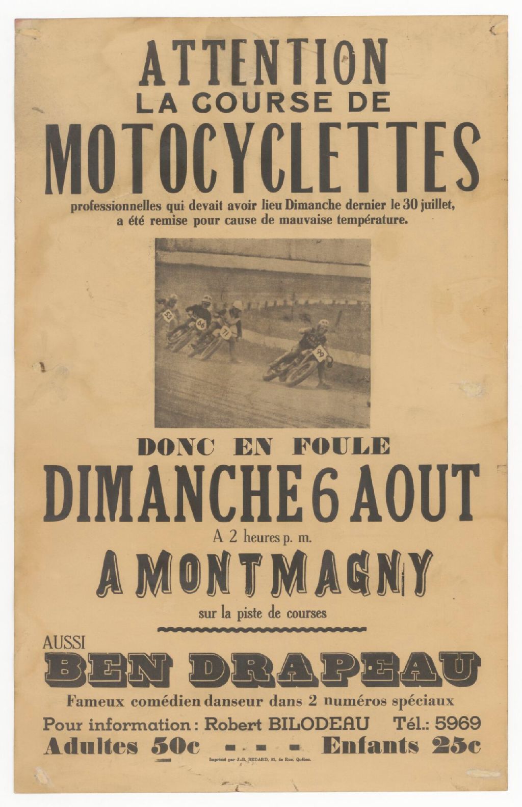 Attention, la course de motocyclettes professionnelles qui devait avoir lieu dimanche dernier le 30 juillet, a été remise pour cause de mauvaise température, donc en foule dimanche 6 août à 2 heures p. m. à Montmagny sur la piste de courses : aussi, Ben Drapeau, fameux comédien danseur dans 2 numéros spéciaux