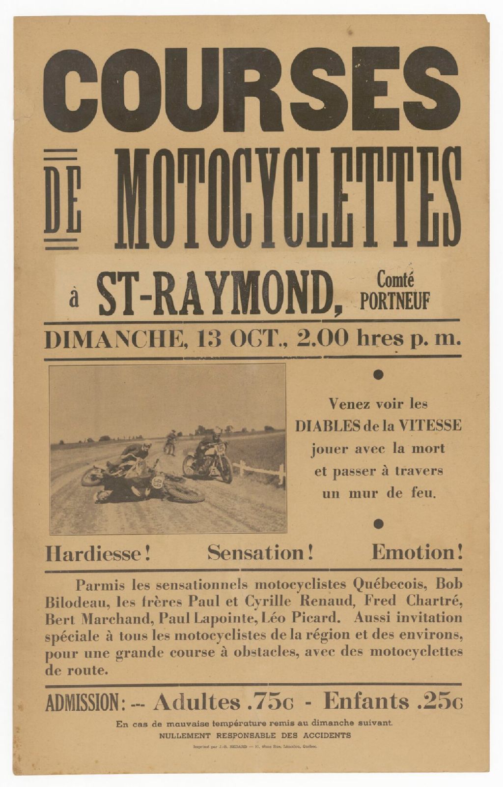 Courses de motocyclettes à St-Raymond, comté Portneuf, dimanche, 13 oct., 2.00 hres p.m. : venez voir les Diables de la vitesse jouer avec la mort et passer à travers un mur de feu : hardiesse! sensation! émotion! ...