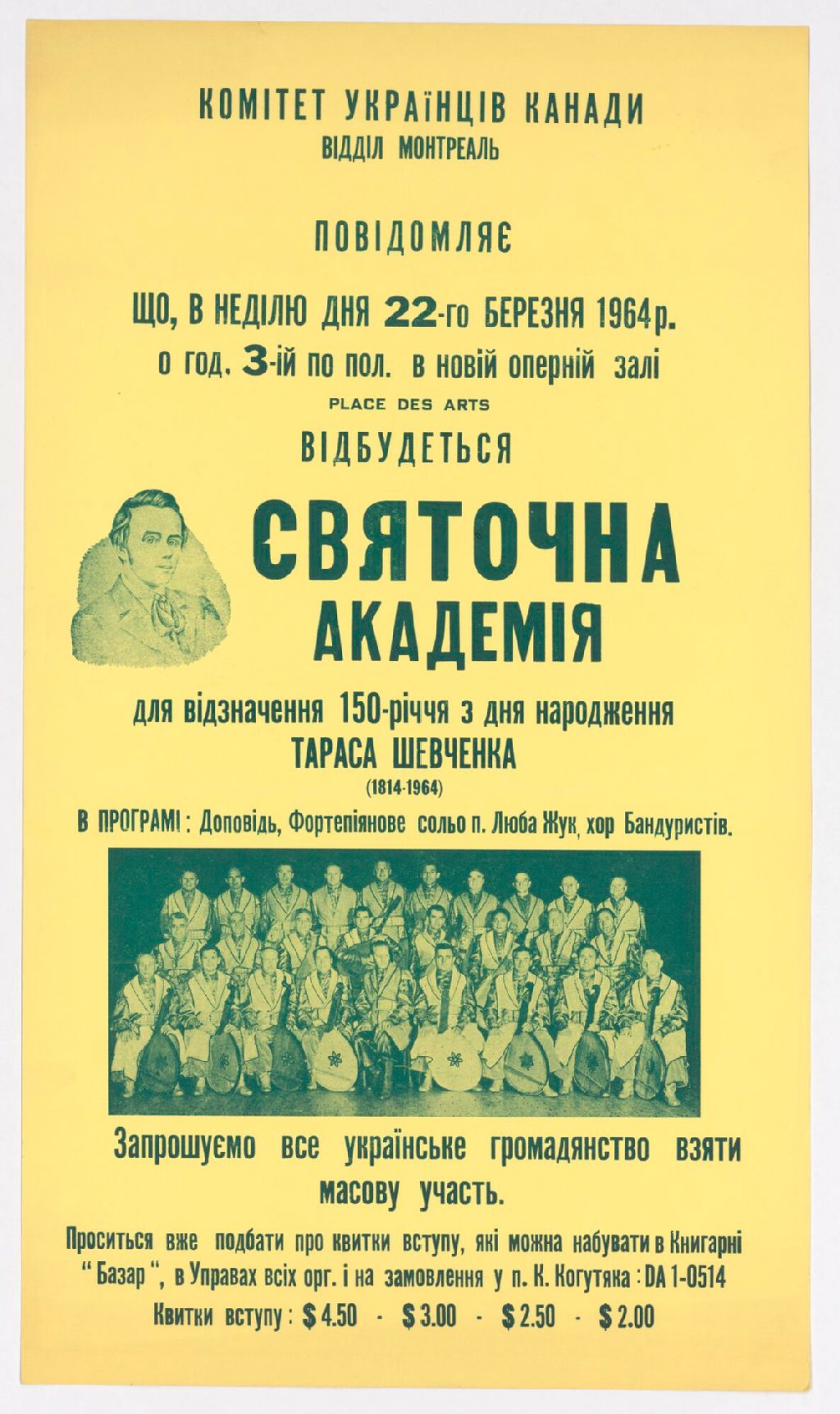 [À l'occasion du 150-ème anniversaire de naissance du poète ukrainien Taras Chevtchenko, 1814-1964, le Comité ukrainien du Canada, Section de Montréal présente l'Ensemble des bandouristes ukrainiens]
