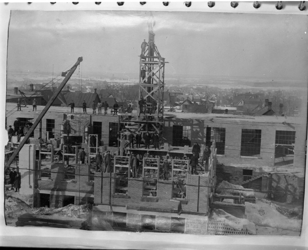 Travailleurs sur un chantier de construction à Hull, Reproduit vers 1985 (original créé vers 1925), Archives nationales à Gatineau, Collection Centre de l'Outaouais de Bibliothèque et Archives nationales du Québec, (07H,P1000,S8,D20,P19), Photographe non identifié.
