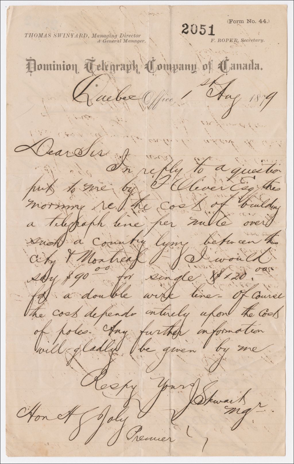 Télégramme de J. Stewart à Henri-Gustave Joly, 1er août 1879, Archives nationales à Québec, Fonds Famille Joly de Lotbinière, (03Q,P351,S4,SS1,P2051).