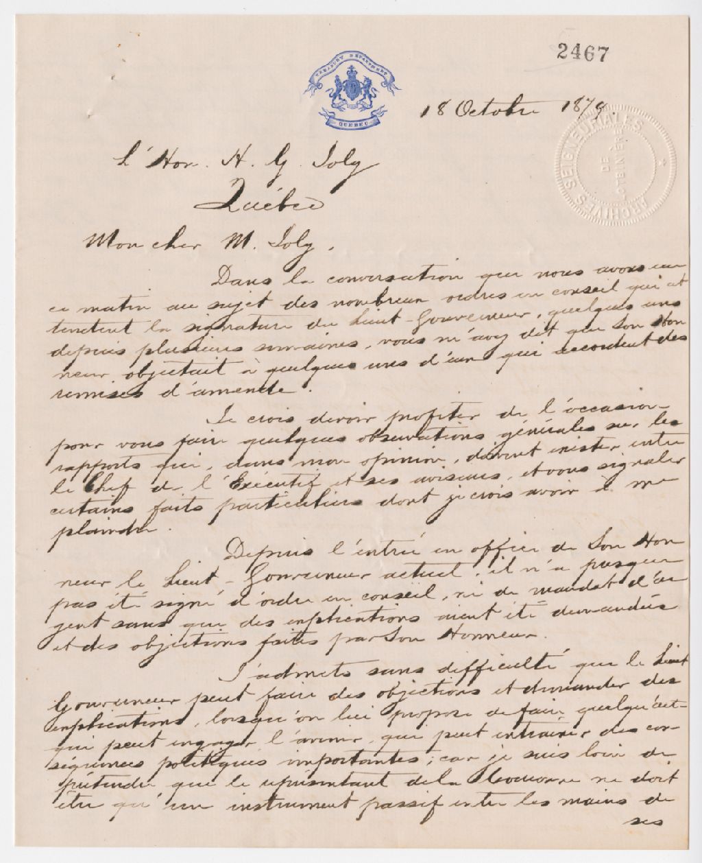 - Lettre de F. Langelier à Henri-Gustave Joly