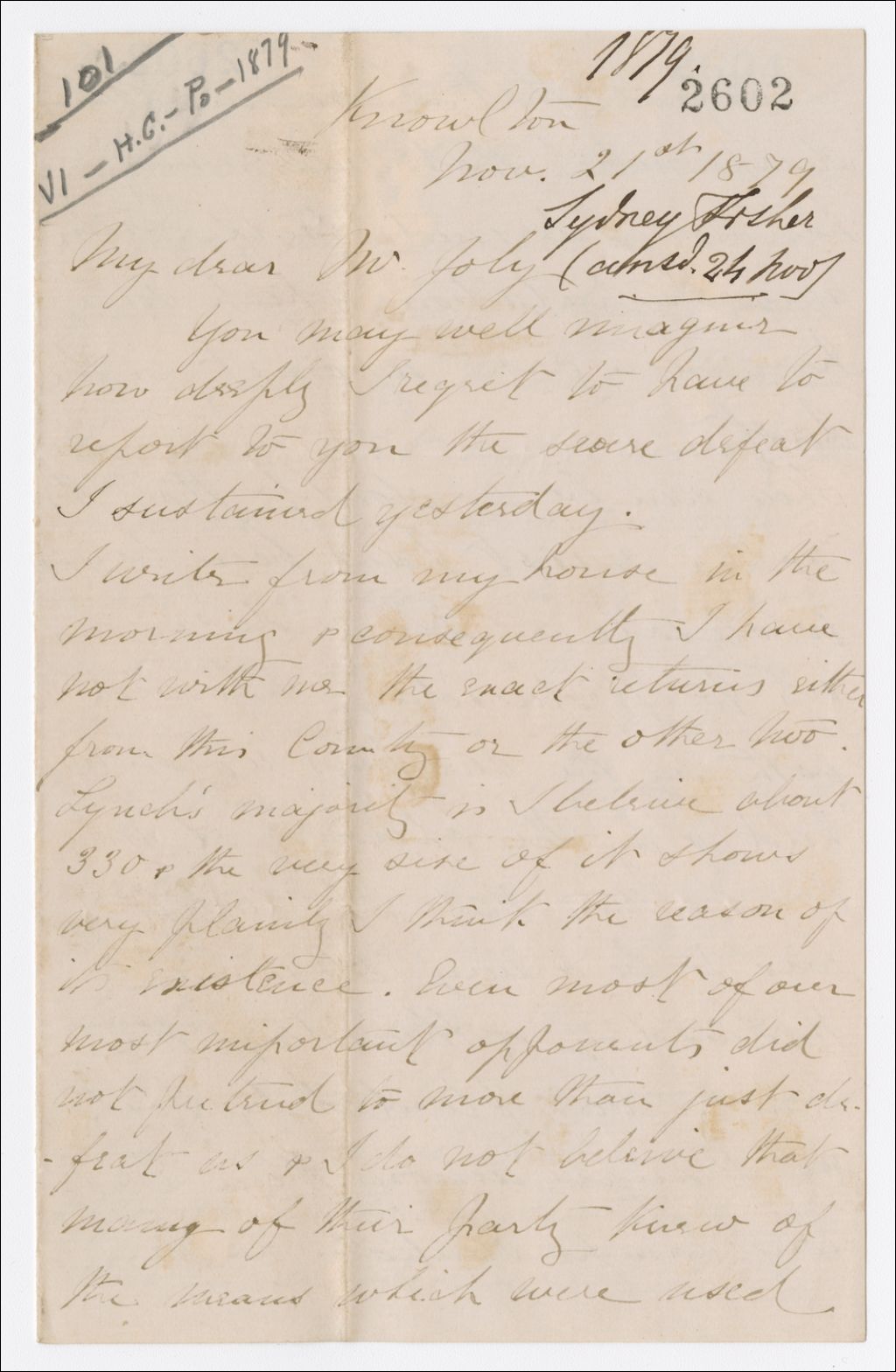 Lettre de Sydney Arthur Fisher à Henri-Gustave Joly, 21 novembre 1879, Archives nationales à Québec, Fonds Famille Joly de Lotbinière, (03Q,P351,S4,SS1,P2602).