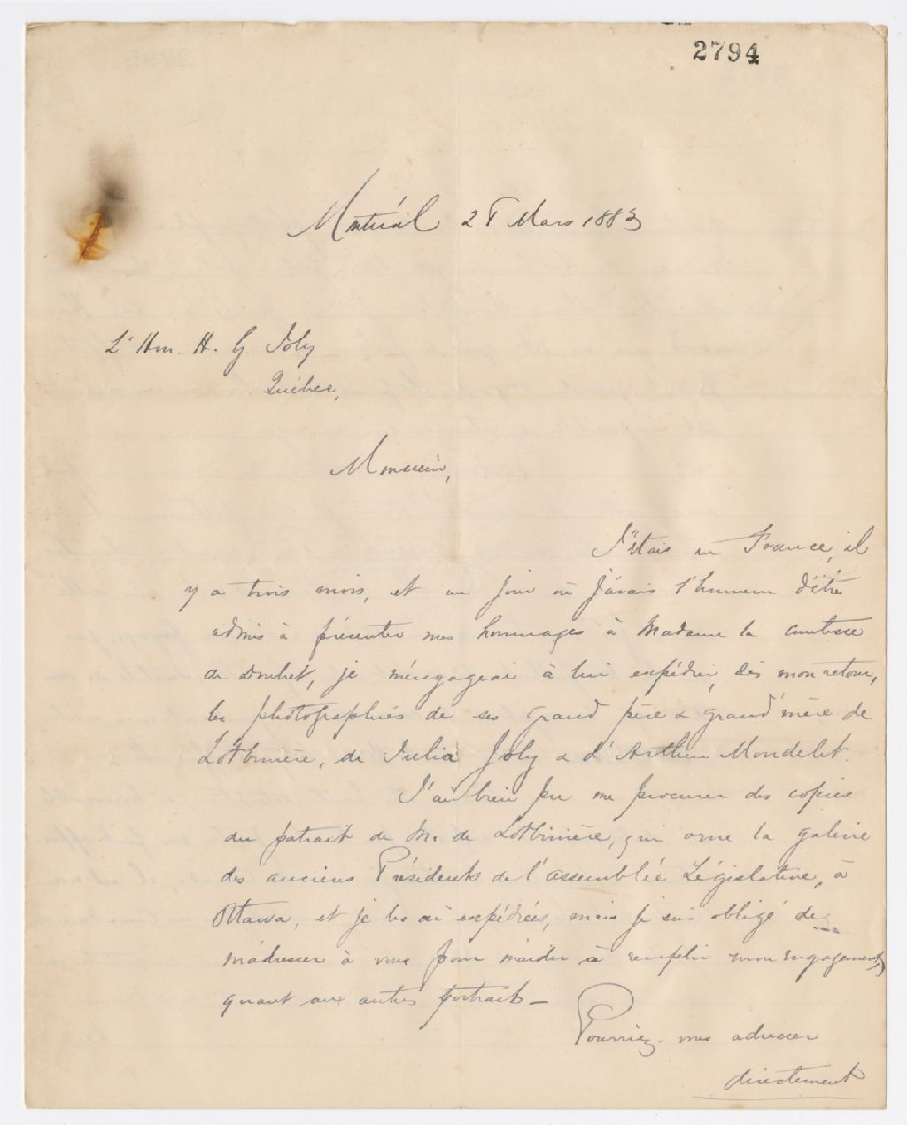 - Demande des portraits de certains membres de la famille de Lotbinière pour les expédier à la comtesse de Douhet. A rencontré des parents de Joly en France durant ses deux derniers voyages