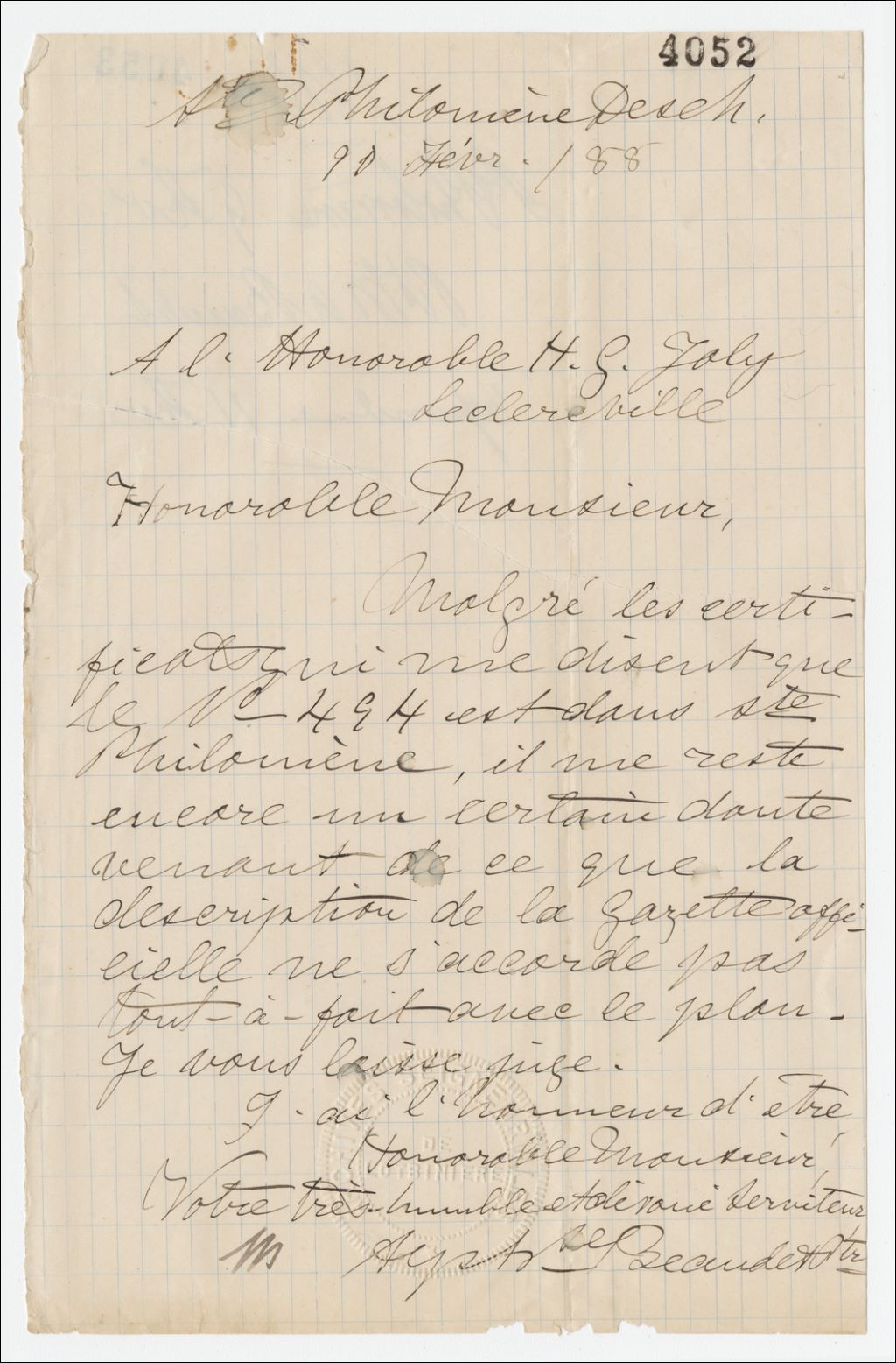 - Malgré les certificats qui lui disent que le no 494 est dans Sainte-Philomène, il lui reste des doutes. La description de la Gazette officielle ne s'accorde pas tout à fait avec le plan. Le laisse juge de l'affaire