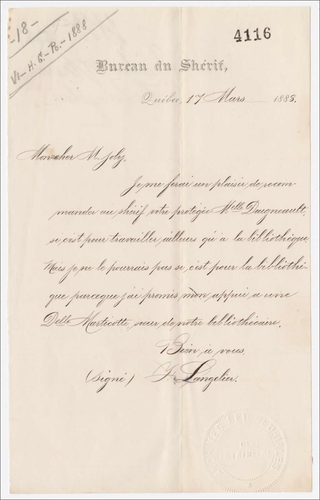 Lettre de F. Langelier à Henri-Gustave Joly
