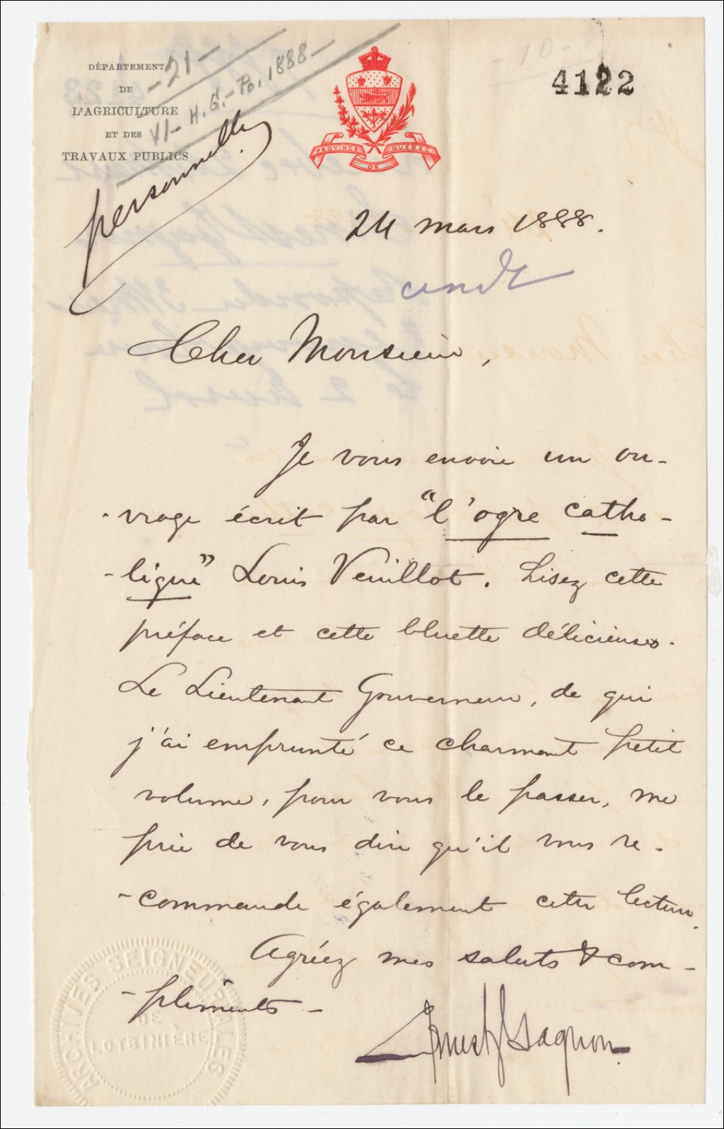 - Lui envoie un ouvrage de Louis Veuillot. Le lieutenant-gouverneur à qui il a emprunté le livre, le prie de lui dire qu'il lui recommande cette lecture