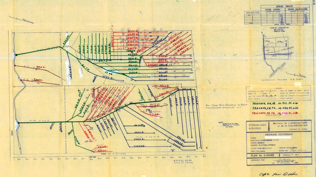 Plan de drainage souterrain annoté pour la municipalité de Buckingham, comté de Papineau. Préparé pour le compte du Ministère de l¿Agriculture et de la Colonisation du Québec.